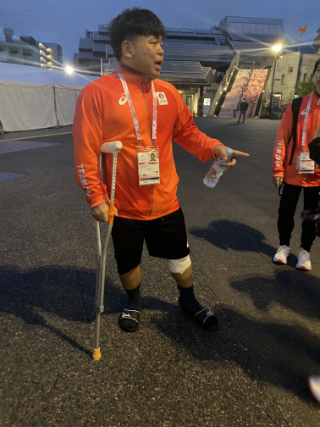 負傷した選手は重症であったため、杖による歩行が必要な状態であった